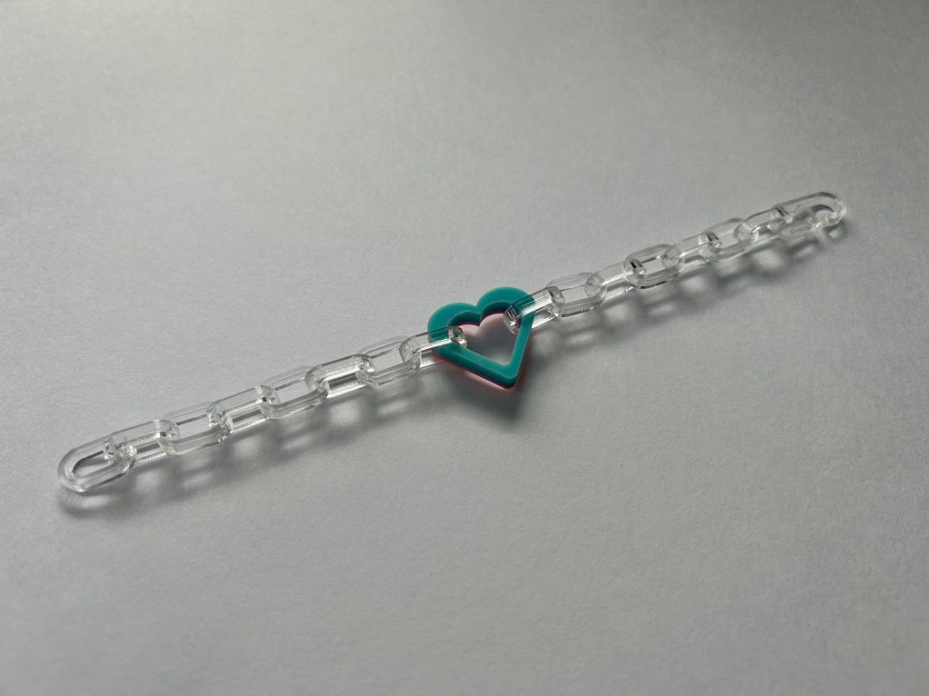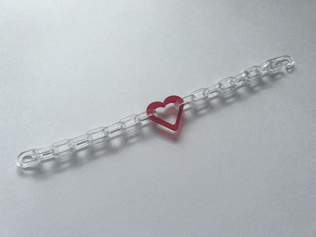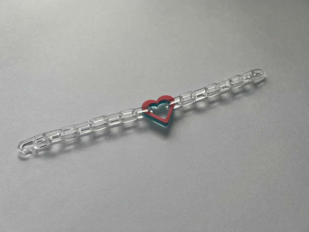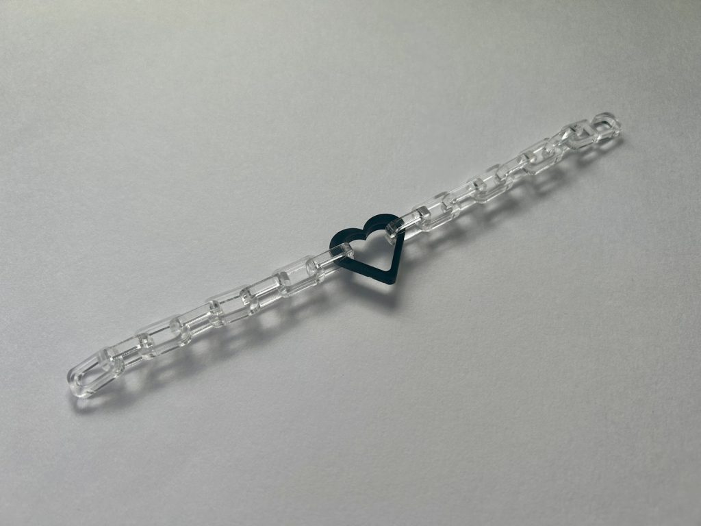 私の作品の魅力は、アクリルならではの透明感と光による繊細な表情です。光を受けることで氷のようにきらめき、見る角度によって印象が変わります。また、ブレスレットの素材として従来は金属が主流でしたが、アクリルでブレスレットを作ることで新鮮さや軽さ、日常使いのしやすさといった差別化要素を打ち出せると考えています。