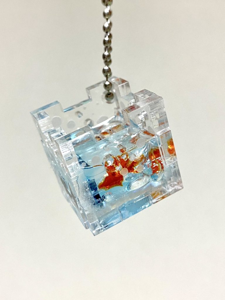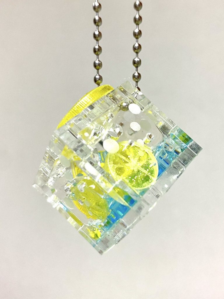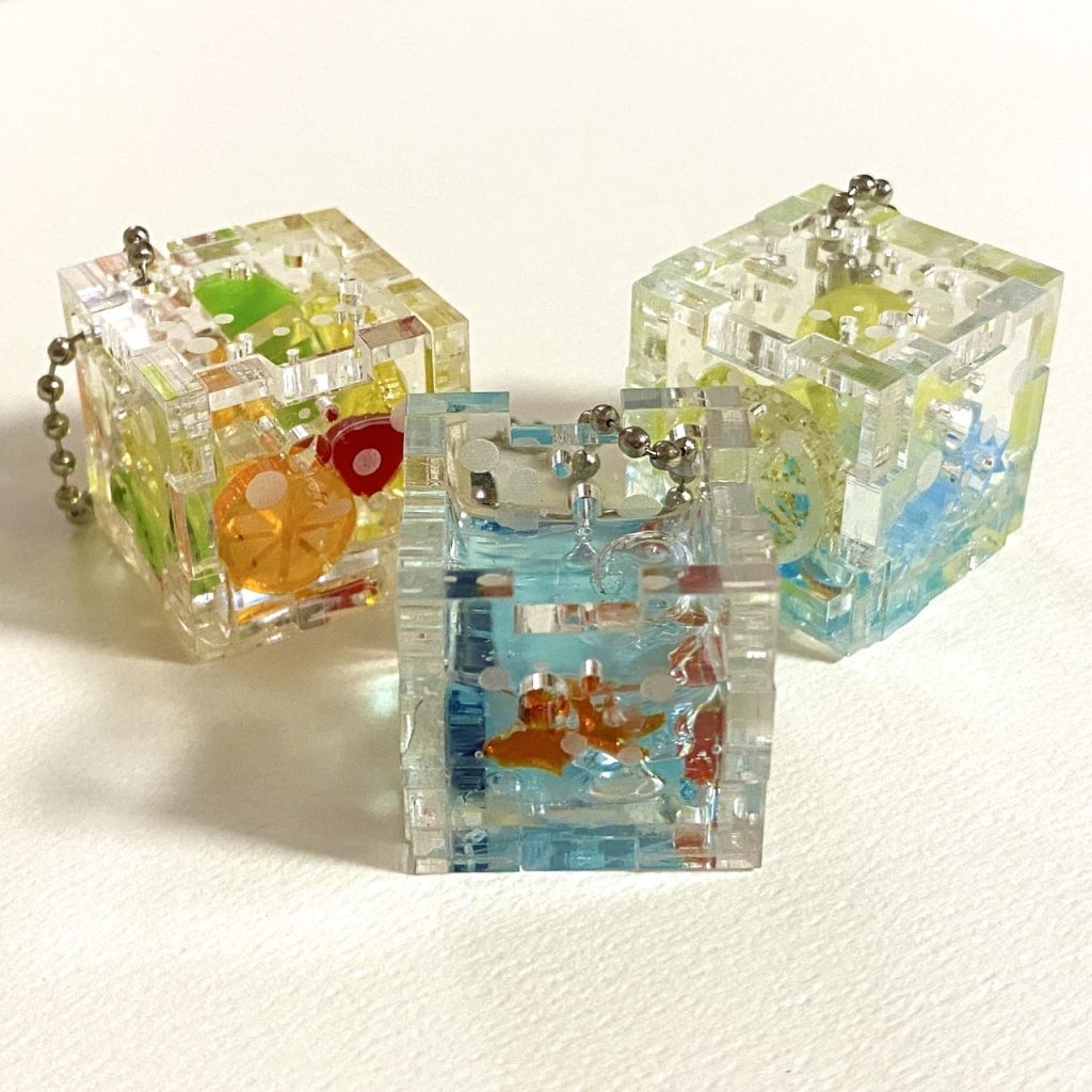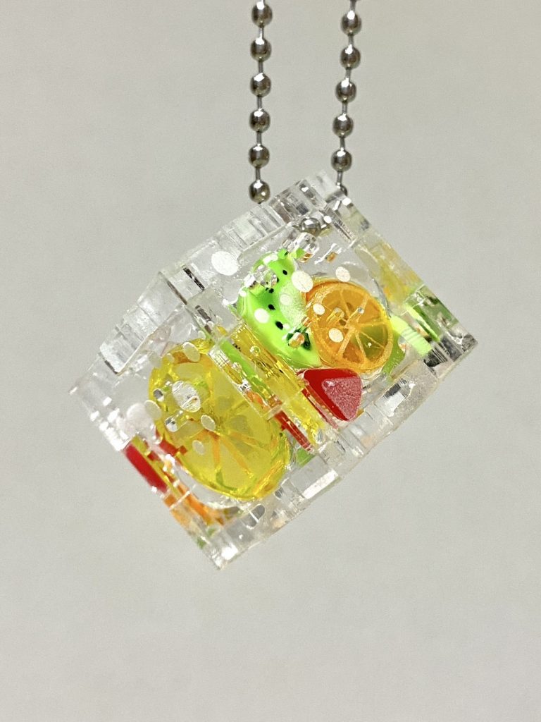 金魚、レモン、フルーツ透明なキューブの中に、小さな世界を閉じ込めたキーホルダー。金魚・レモン・フルーツ、それぞれが光を受けてきらめきます。手のひらで楽しめる、小さな癒しと透明感をお届け。いつでも持ち歩ける小さな”涼”をどうぞ!