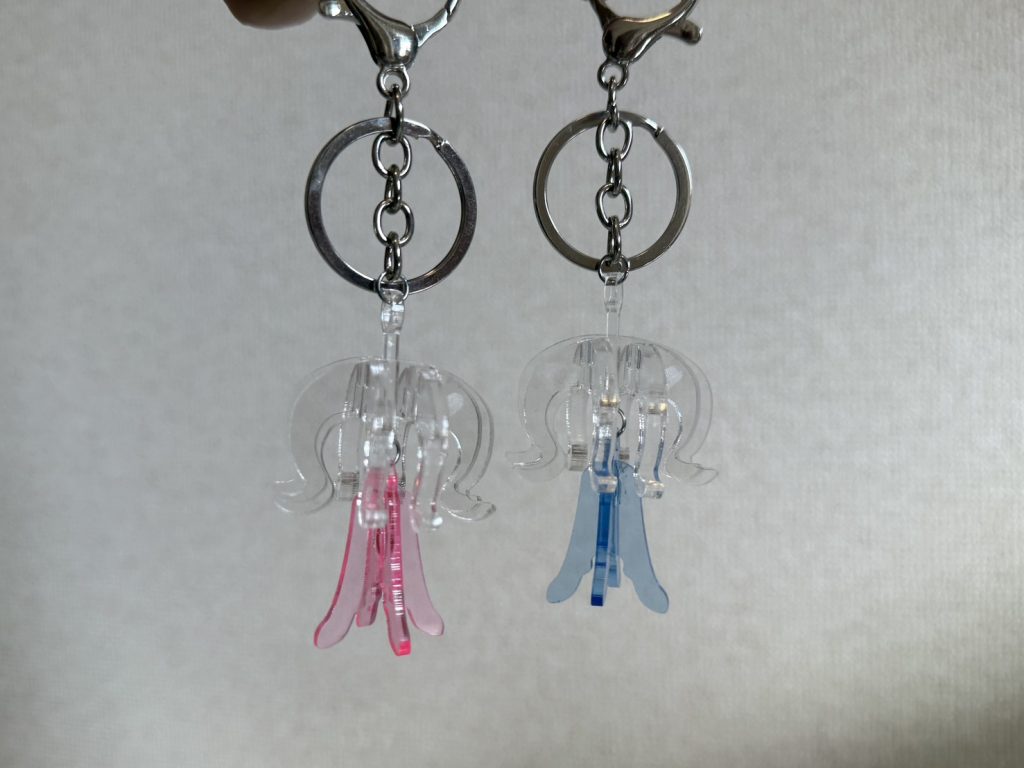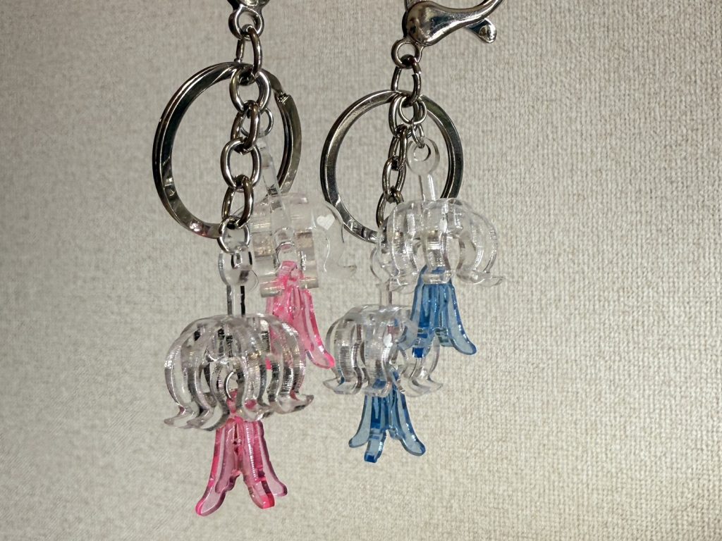透明なアクリルを重ねて作った、ゆらめくクラゲのキーホルダー。青とピンクの足が光を受けて淡く変化し、水の中のような透明感を楽しめます。