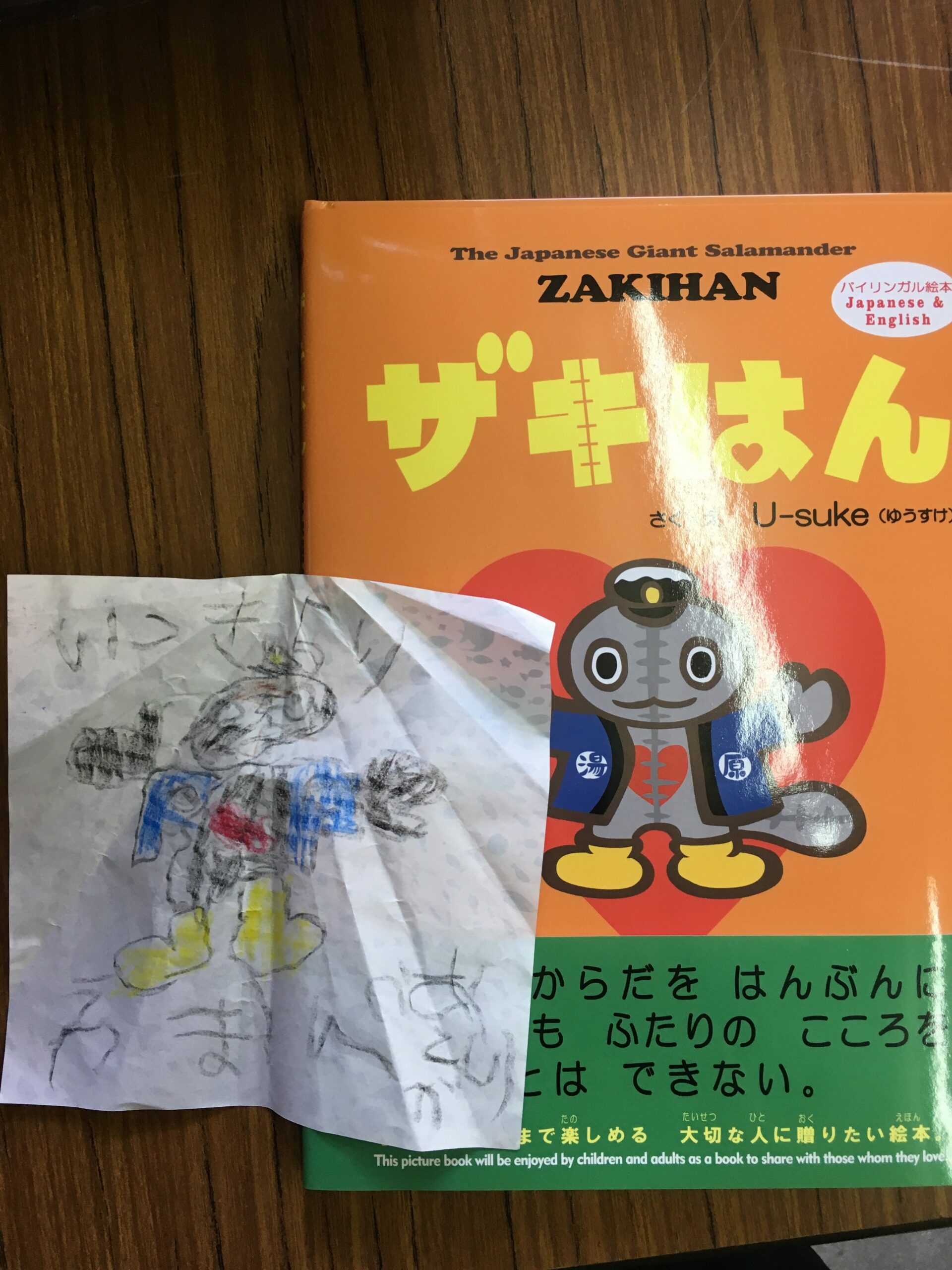 昨年のはんざき祭りで「ザキはん」の絵本を買ってくれた子供が、「ザキはん大好き」といってザキはんの絵を描いてもってきてくれました。ほかにもたくさんのザキはん好きの子供たちに声をかけてもらいました。