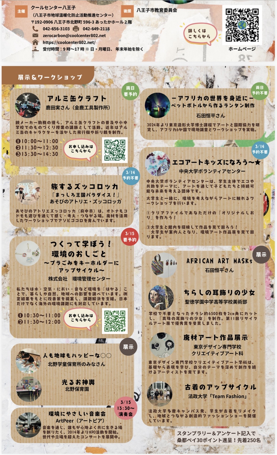 「ペットボトルランタン」などのワークショップや不要チラシで制作した「真珠の耳飾りの少女」などの作品を展示していますので、ぜひお出かけください。