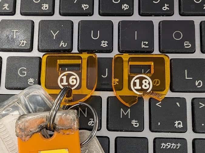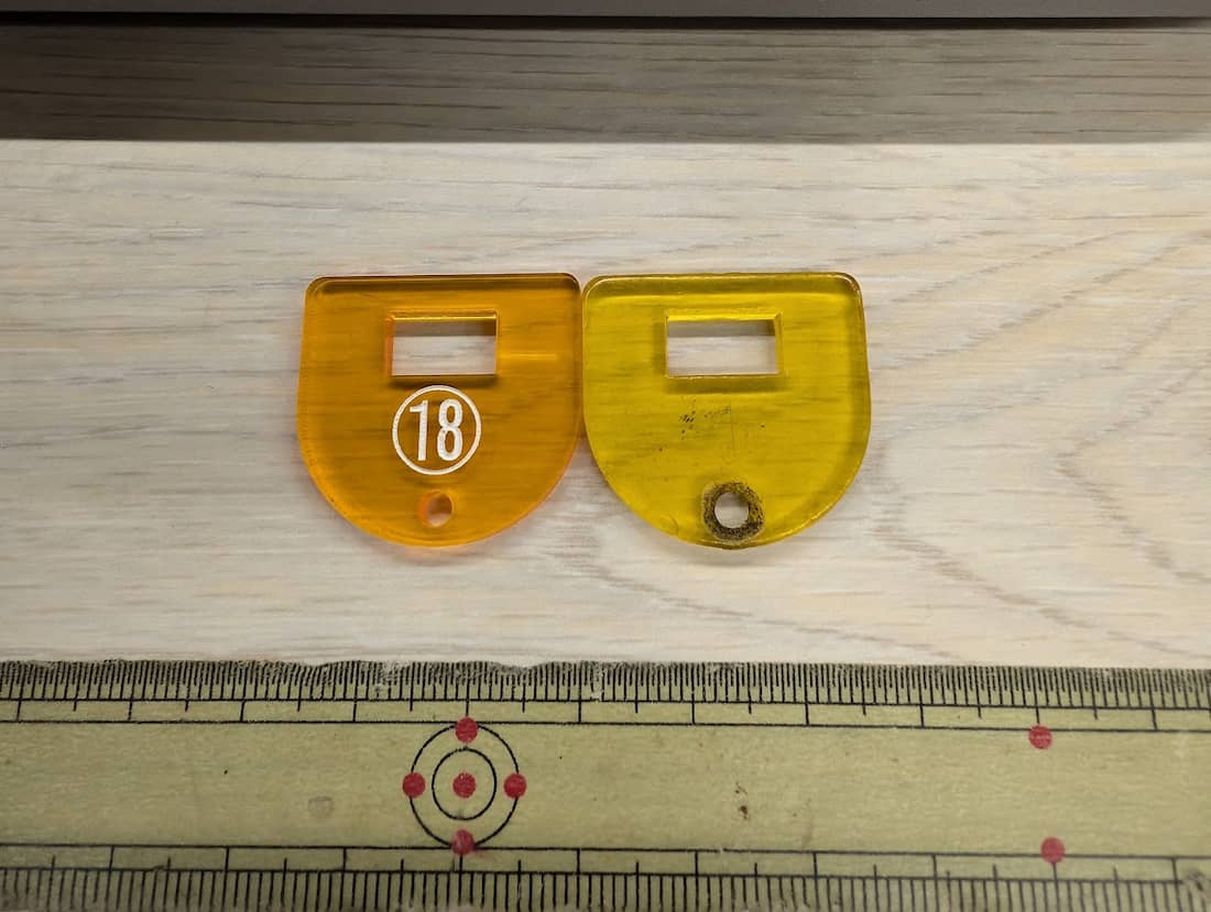 今回作り直すのは、このように真ん中を留めているところが見事に割れてしまったアクリルのタグです。これでは使いものになりませんので、新しいタグを製作いたします。