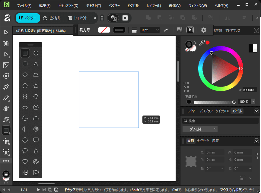デザインソフトを問わず基本となるのは、まず土台の形を作ることです。Affinity Designerの四角形ツール(パワーポイントなどと同じようなツール)を使い、採寸したタグの外形と同じサイズの四角形を描画します。描画後、寸法入力フィールドに正確な数値を入れればその形の調整は完了です。イラストレーターやCorelDRAWと使用感はそれほど変わりません。