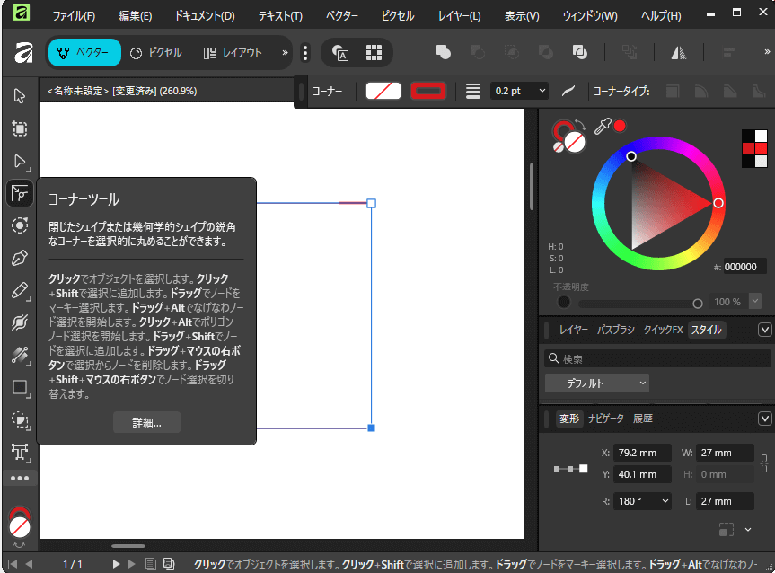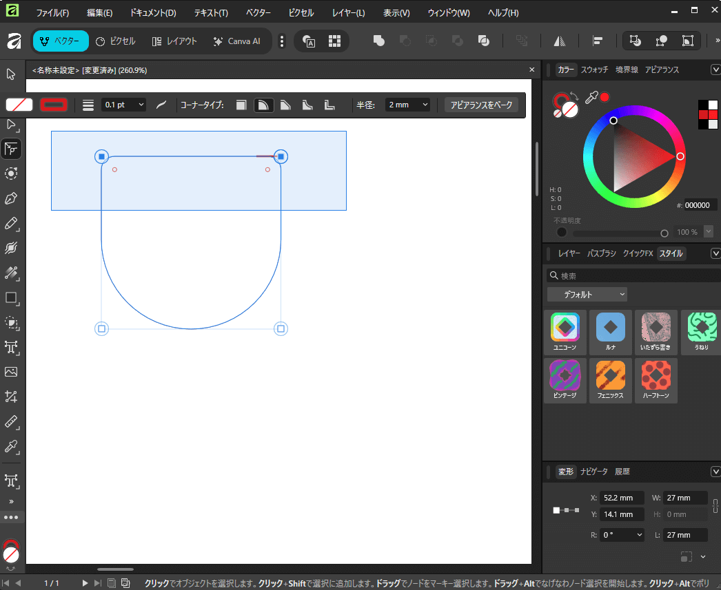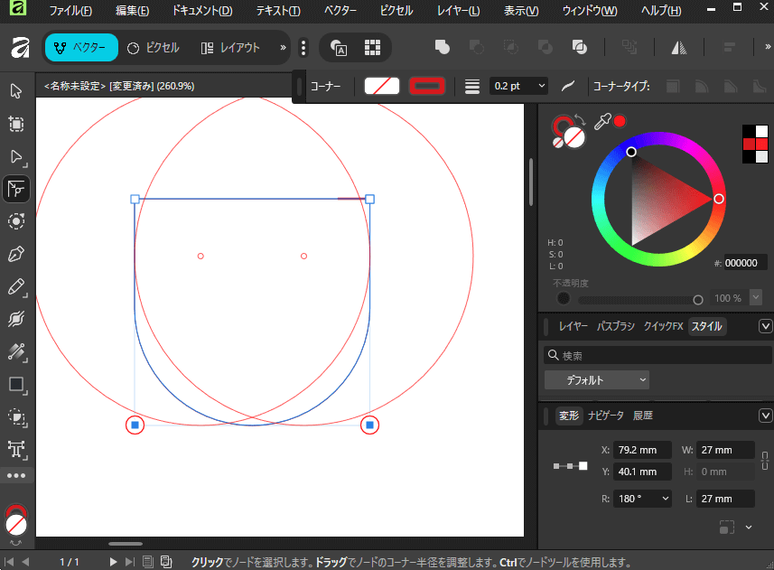 次にタグの特徴である角丸を設定します。このタグは下半分が丸く、上半分は角が立っているため、Affinity Designerのノードツール(矢印の上から2つ目のツール)を活用します。まずこのツールで、四角形の下の2つのポイント(ノード)だけを選択し、上部のコンテキストバーにある「コーナー」設定で角丸を付けていきます。数値を最大まで動かすと、下の辺全体が半円状になります。