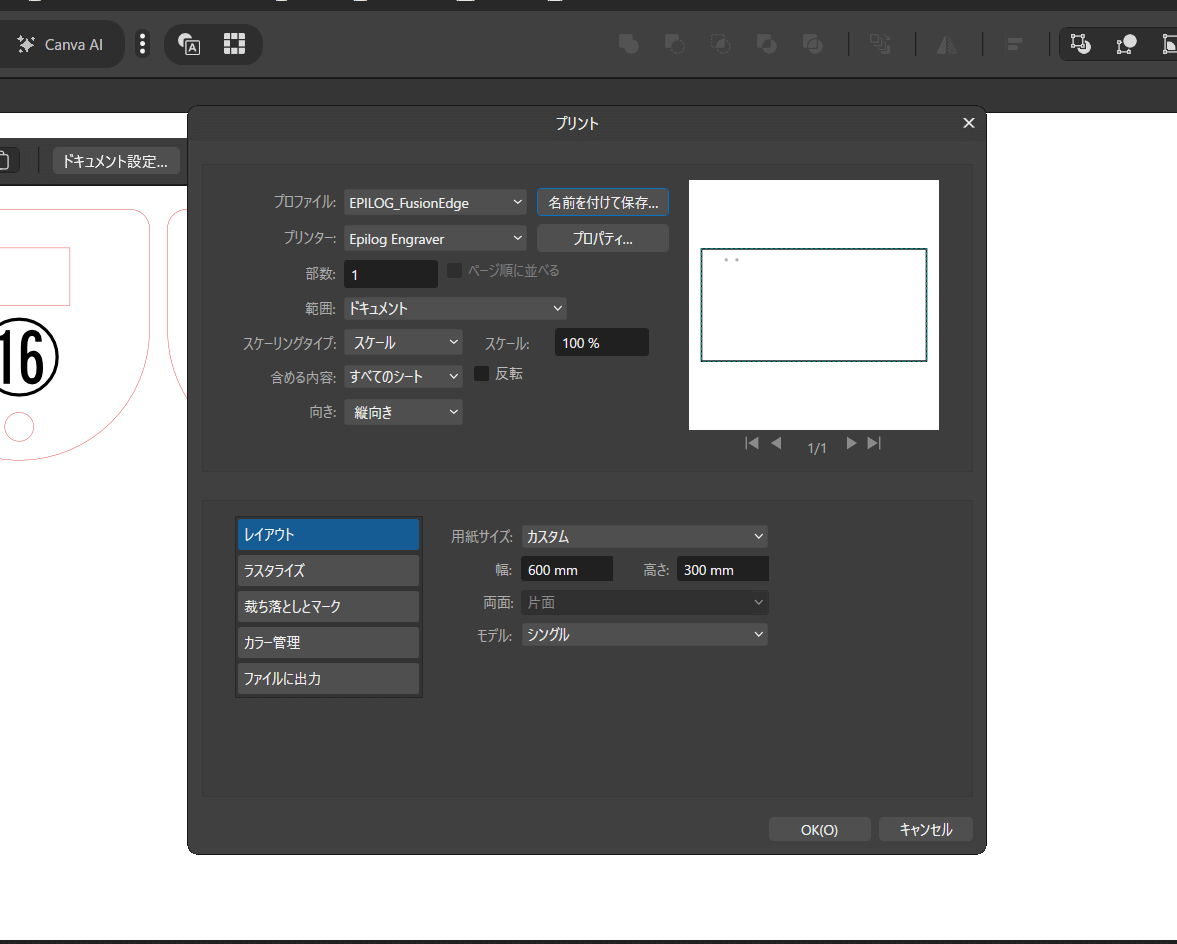 ここで少しだけコツがあり、レーザーカッターの加工エリアを正しくプリンターに伝える必要があります。用紙サイズは「カスタム」を選択し、今回使用するFusion Edge 12の加工エリアの寸法である600 mm × 300 mmを入力します。また、向きの部分を「縦向き」に設定します。