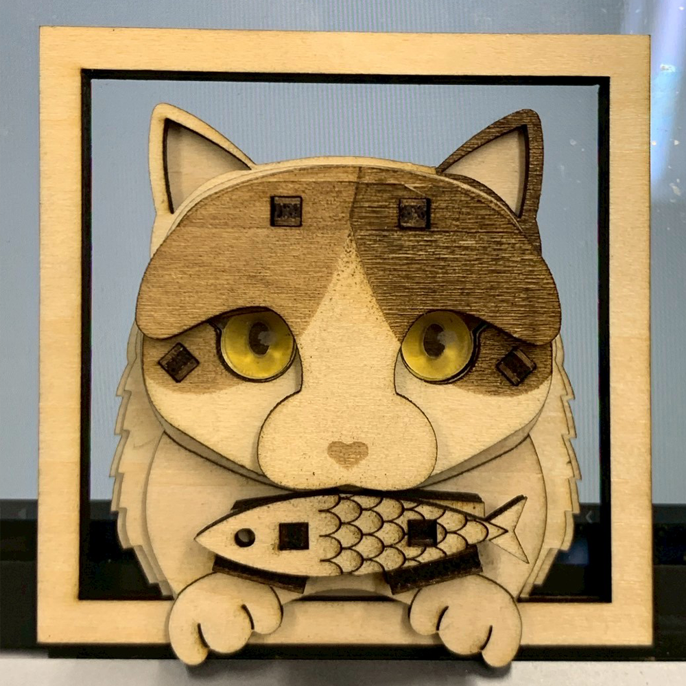 はじめてのレーザー加工機に戸惑いながらも、1年生のときに学習してきたデザインソフト「adobe illustrator」を使って加工データを制作し、ベニヤやアクリル等を使って制作しました。